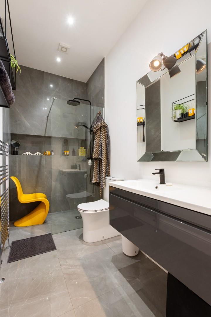 Generous in size and tastefully presented with a fully tiled step in shower with glass screen.