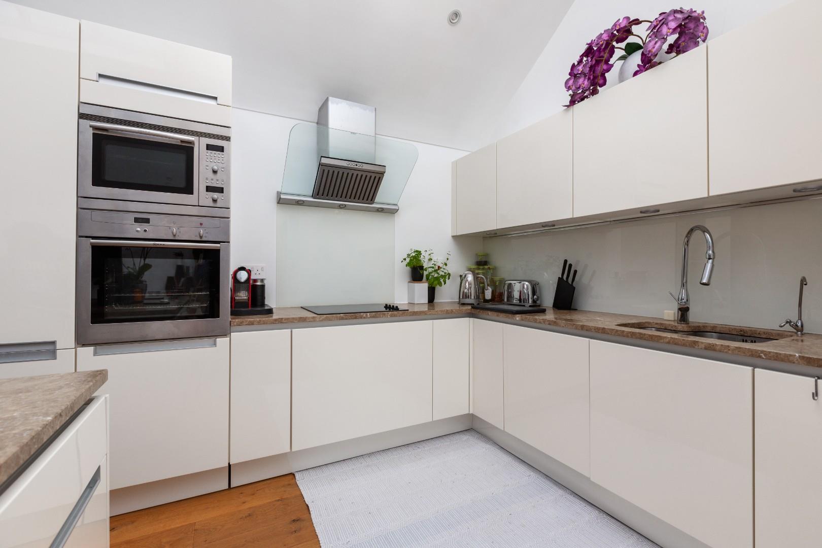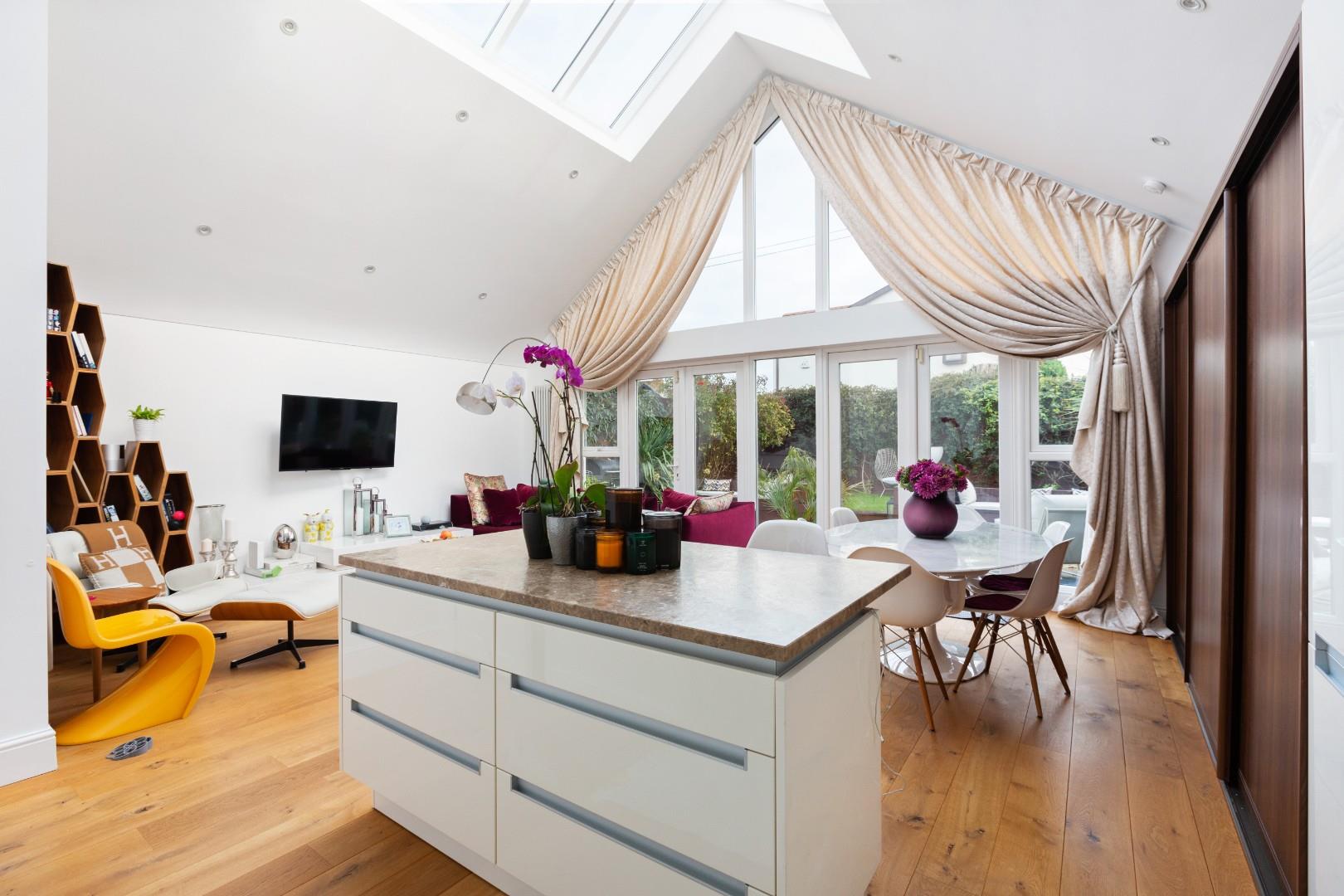 Impressive double height open plan room overlooking the rear garden. The Poggenphol kitchen is fitted with an extensive range of high gloss cream wall and floor units with granite countertops, and incorporating integrated dishwasher, fridge freezer, oven, microwave and hob. There is a granite topped kitchen island with additional storage below. Ample dining and living space.