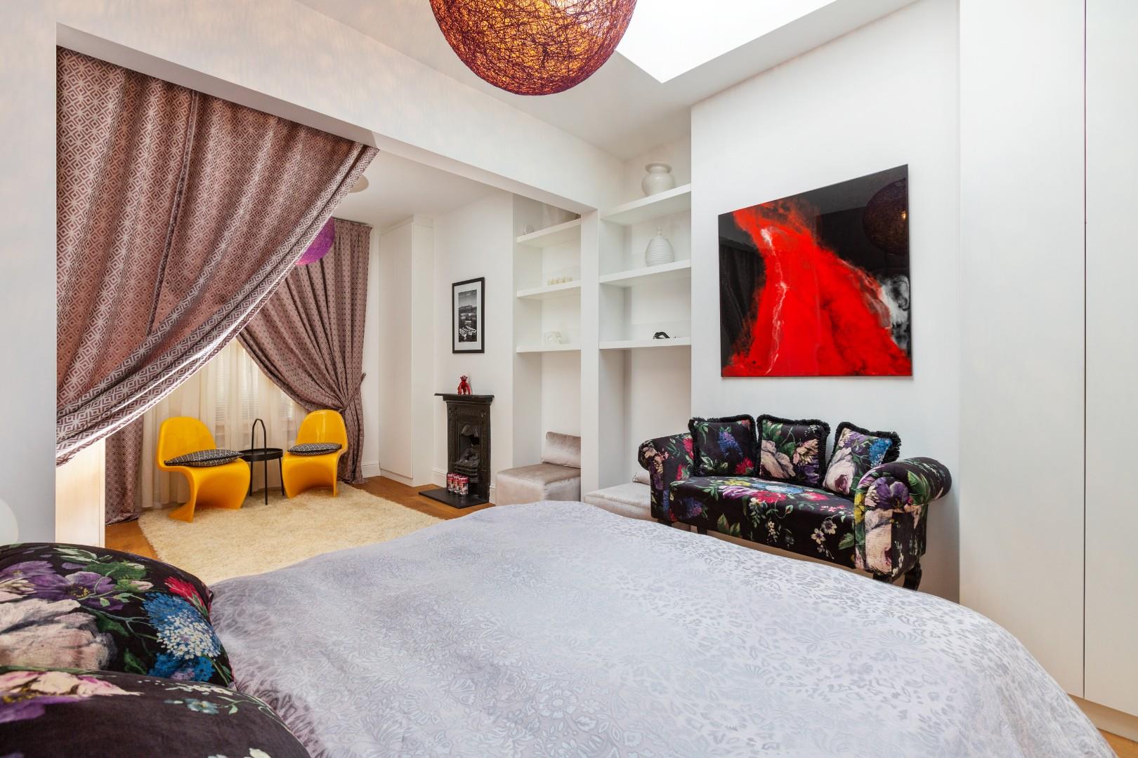 Large master suite with cast iron fireplace, generous fitted wardrobes, sliding doors open to the…