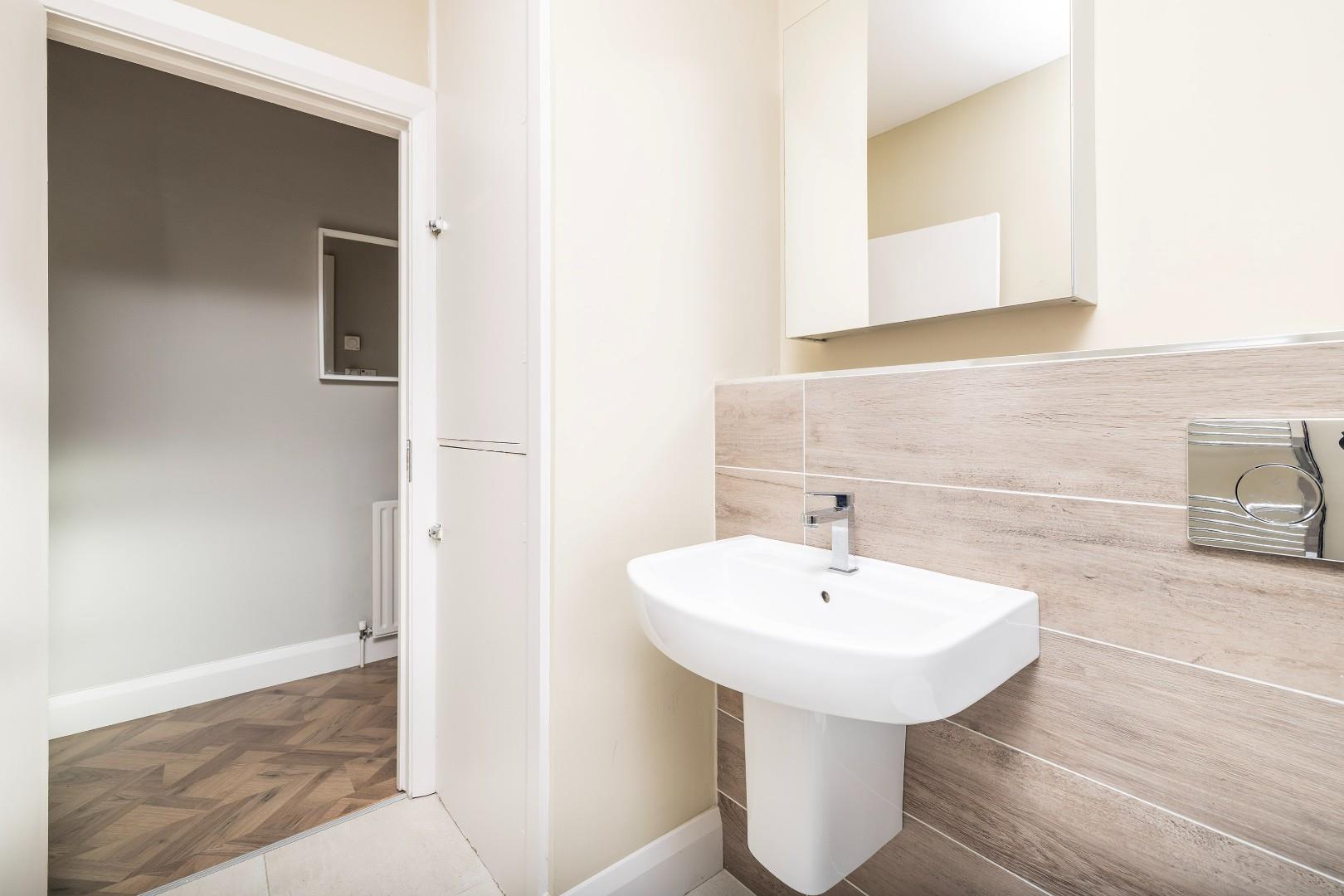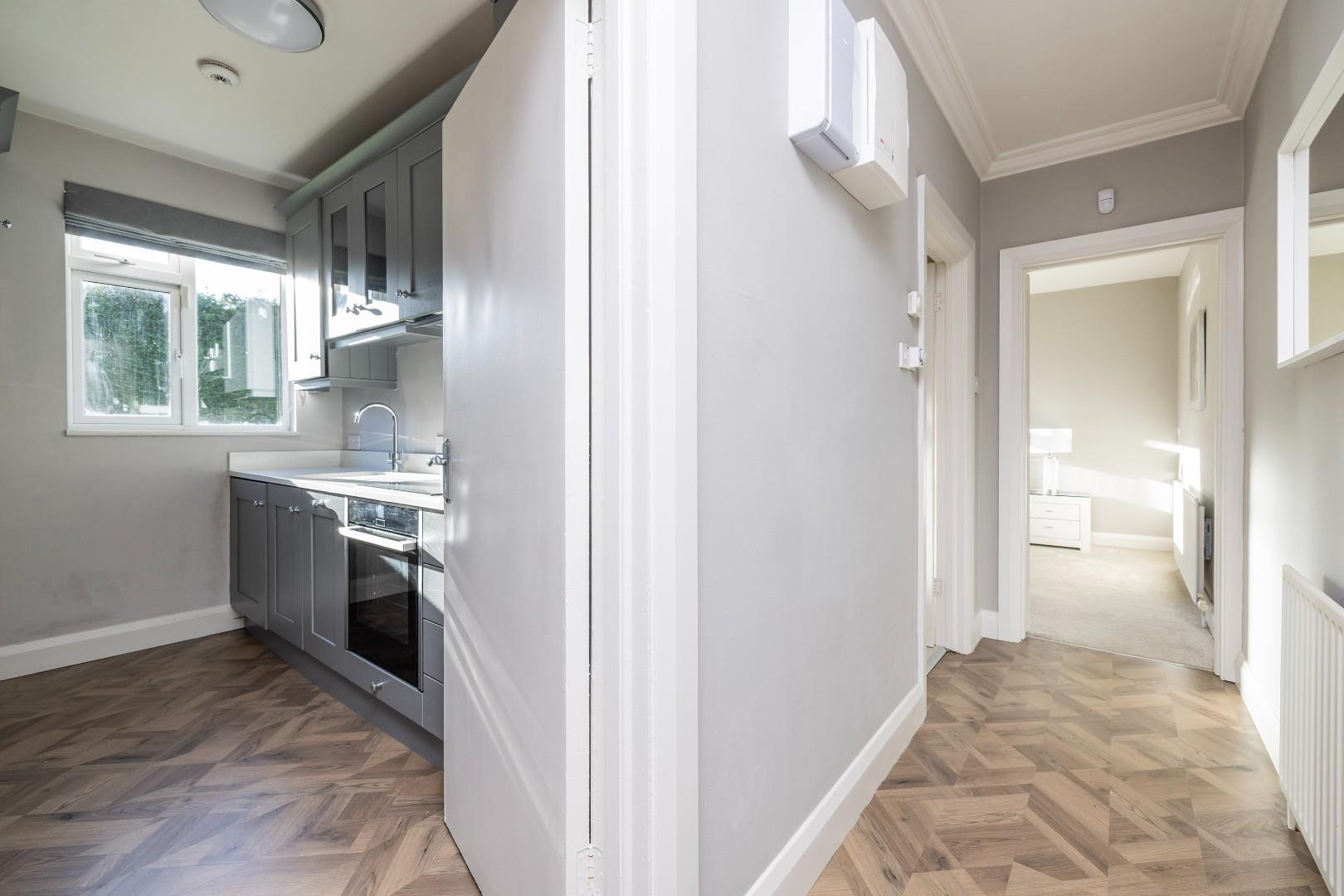Galley style with an array of floor and wall mounted Shaker style units with built-in oven and ceramic hob and concealed extract unit with complimentary quartz style worktops and splashback. There is an integrated fridge/freezer, dishwasher and washing machine. The GFCH boiler is in the kitchen.