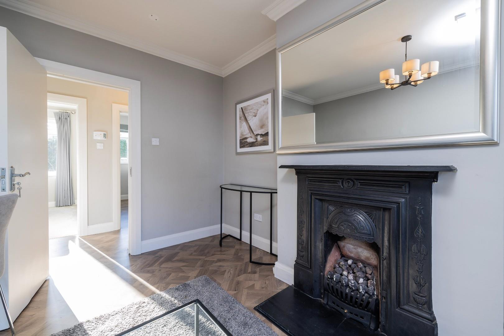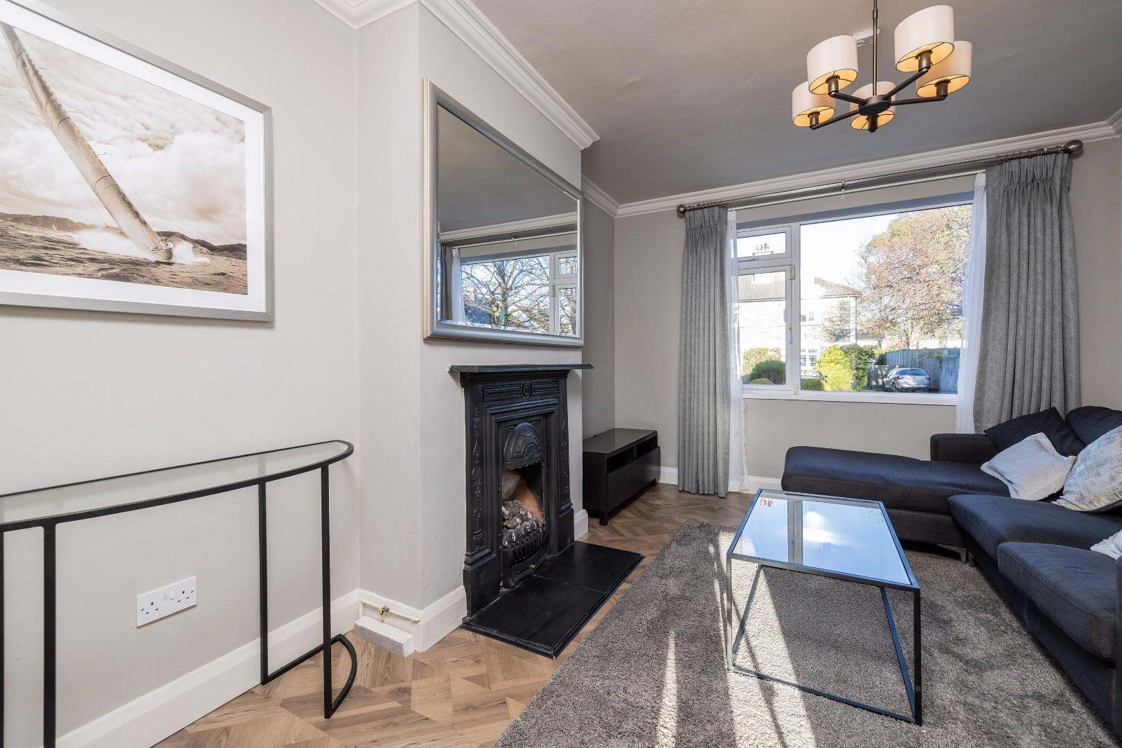 This is a spacious, light filled room with laminate wooden flooring and attractive period style fireplace fitted with a coal effect gas fire.