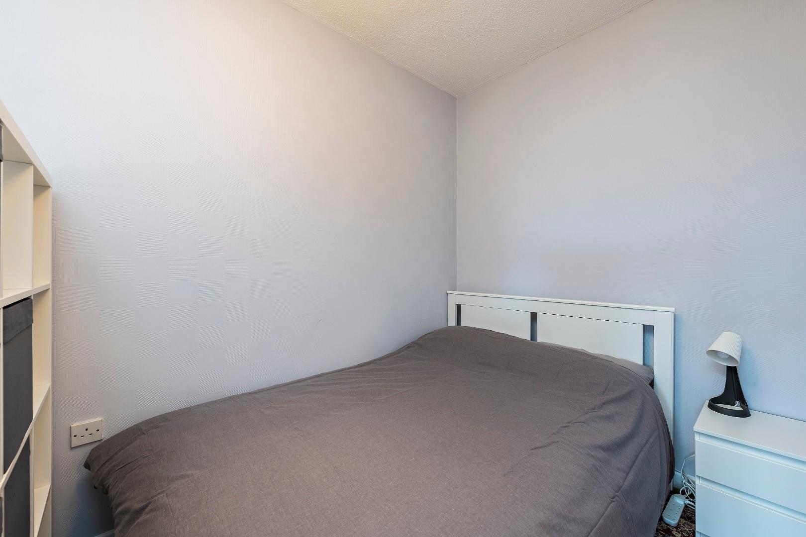 Set to the rear of the studio, there is a double bed, block storage shelves, wardrobe and storage trunk