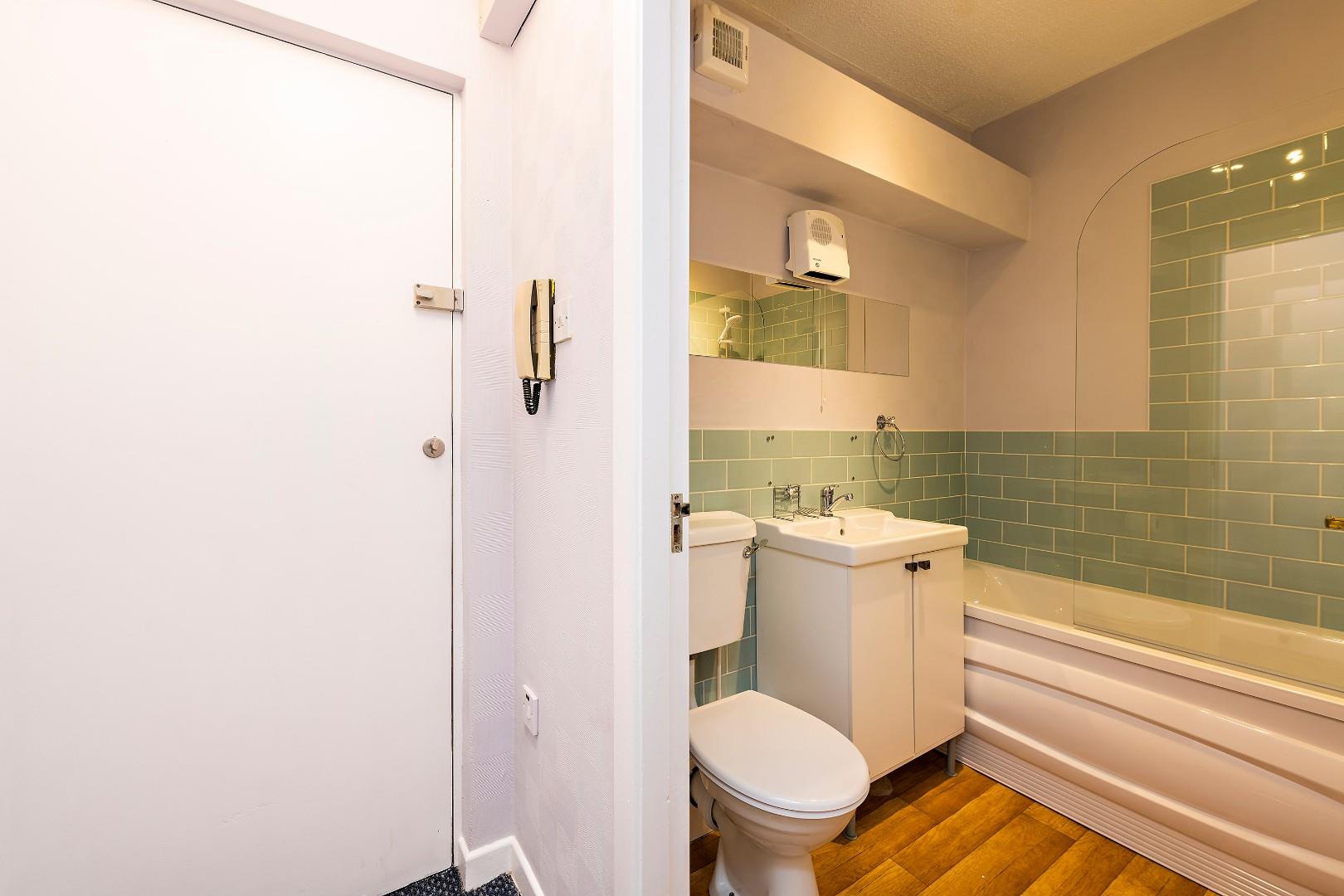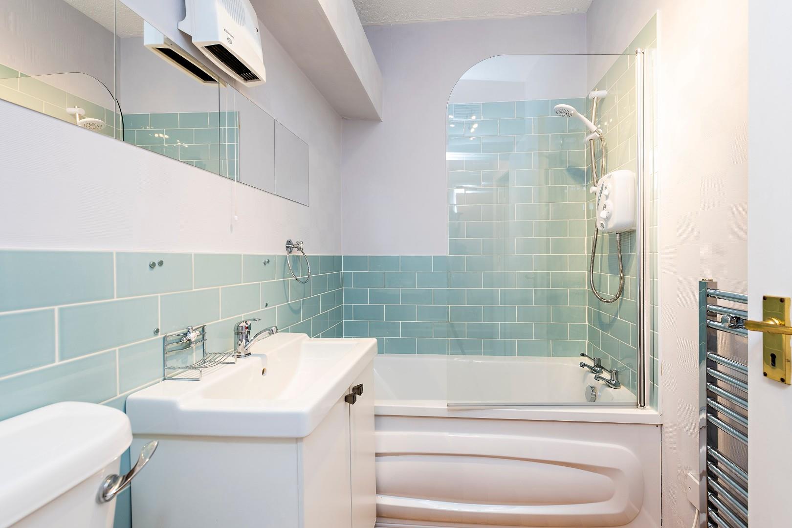 Recently upgraded, the bathroom features white sanitary ware comprising of a w.c., w.h.b. set in vanity unit, wall mirror, chrome towel rail and a bath with tiled surround and Triton electric shower