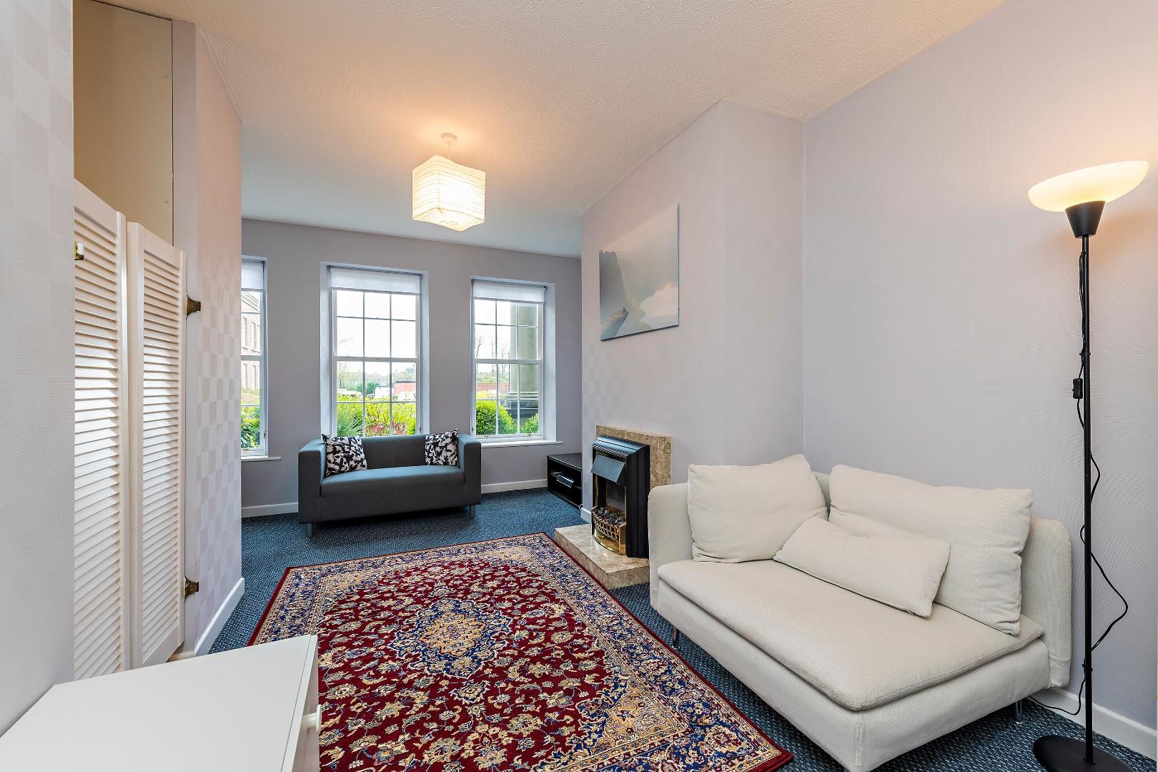 The living/dining area features a fireplace with electric fire, fitted shelves and three sash windows (double glazed) overlooking the gardens. Access to the kitchen.