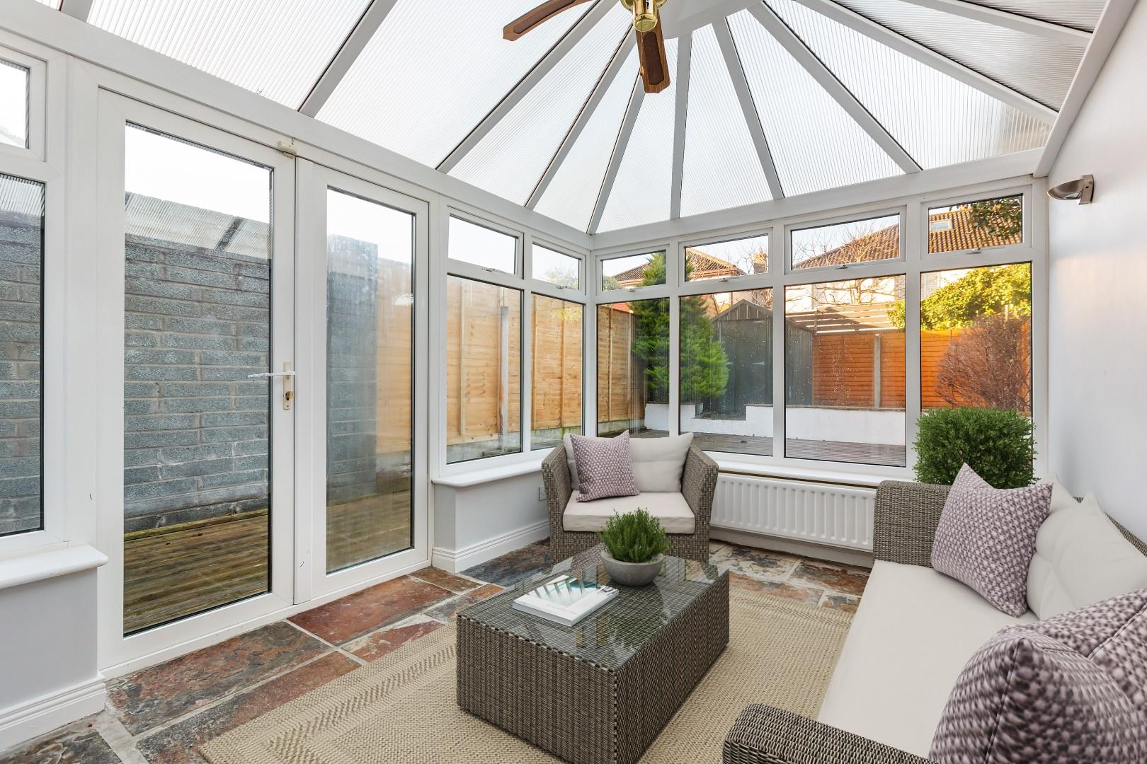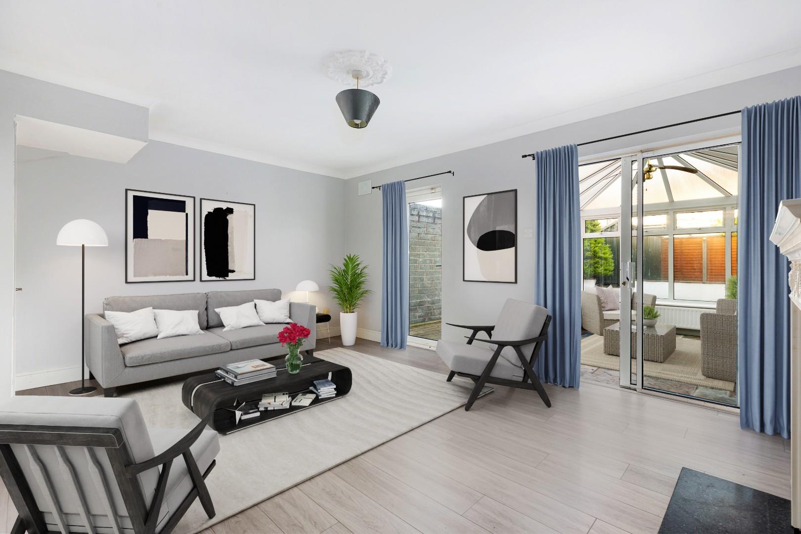 Large light filled reception room spanning the width of the house. Feature fireplace with a gas fire inset, wooden flooring and a sliding glass door opens to the sunroom. Convenient understairs cloakroom.