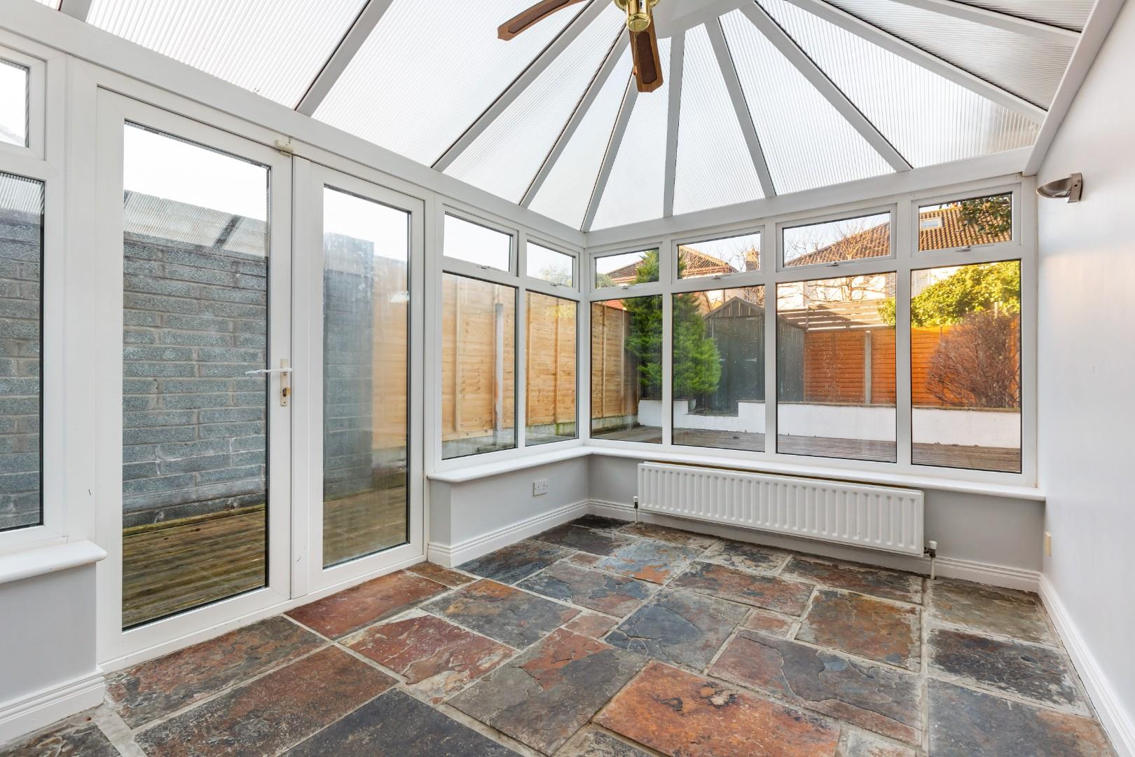Bright light-filled room with a westerly orientation. Attractive stone floor tiling and centre ceiling fan-light. French patio doors open to the rear deck and garden.