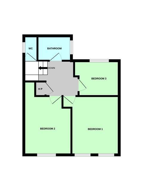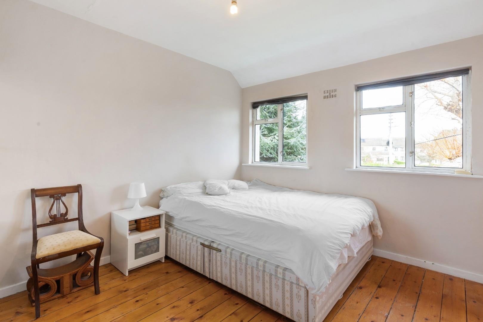 Large light-filled room with three windows overlooking the front gardens. Built in book shelving, fireplace and wooden flooring.