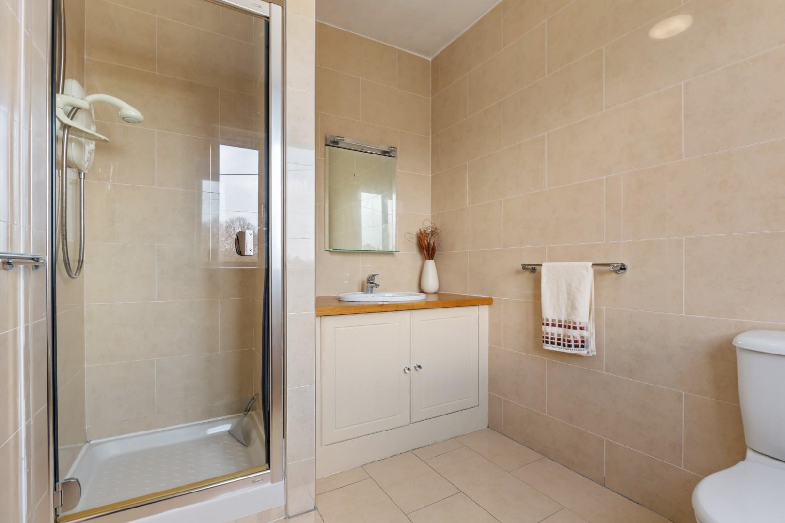 Large shower room which is fully tiled and comprises: W.C. Vanity wash hand basin with cupboard under and a mirror above. Shower cubicle with electric Mira shower. Window the front aspect.