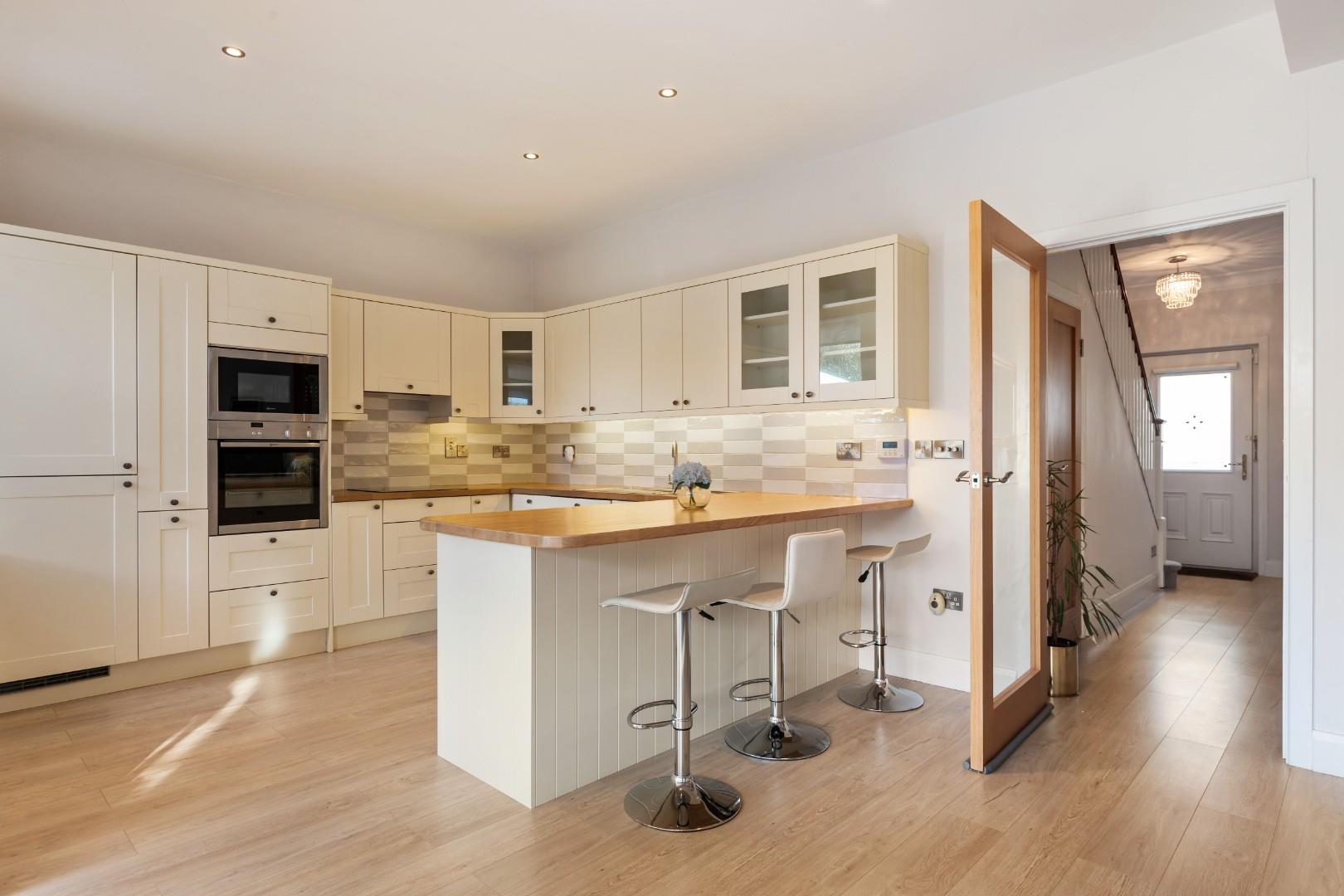 The kitchen is fitted with shaker style wall and floor cupboards with Oak worksurfaces over and a stylish breakfast bar for casual dining. Appliances include an electric oven and hob, Integrated fridge freezer and dishwasher.