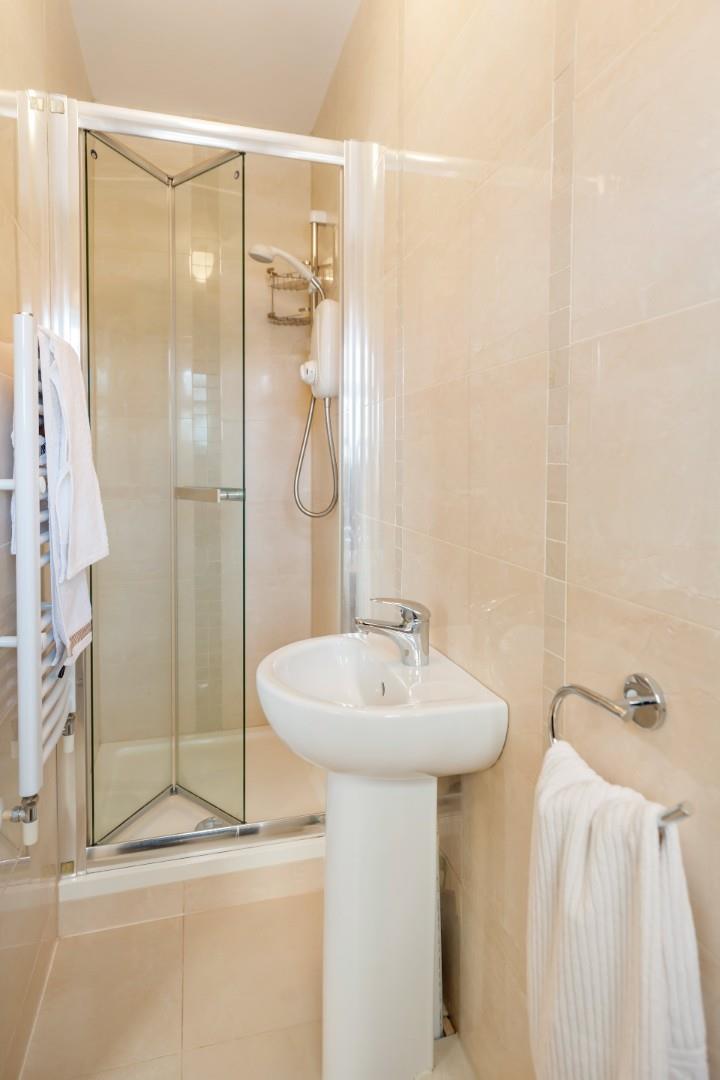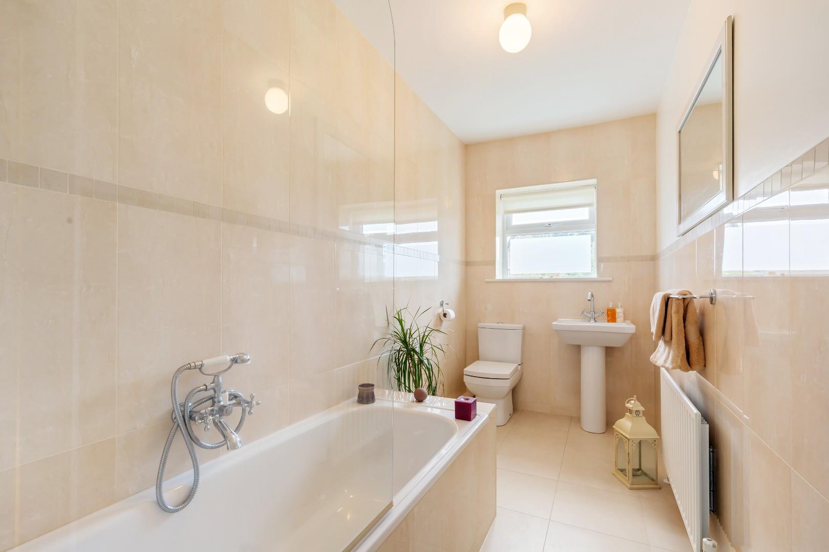Stylish bathroom, fully tiled and complete with W.C., wash hand basin and bath with a glass shower screen and an electric shower.