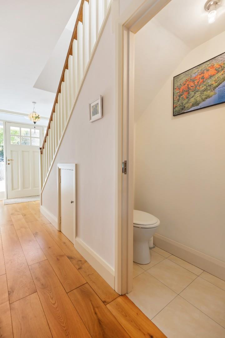 A stylish and modern front door opens to the Inviting entrance hall with wide plank floorboards, picture rails and convenient understairs storage.