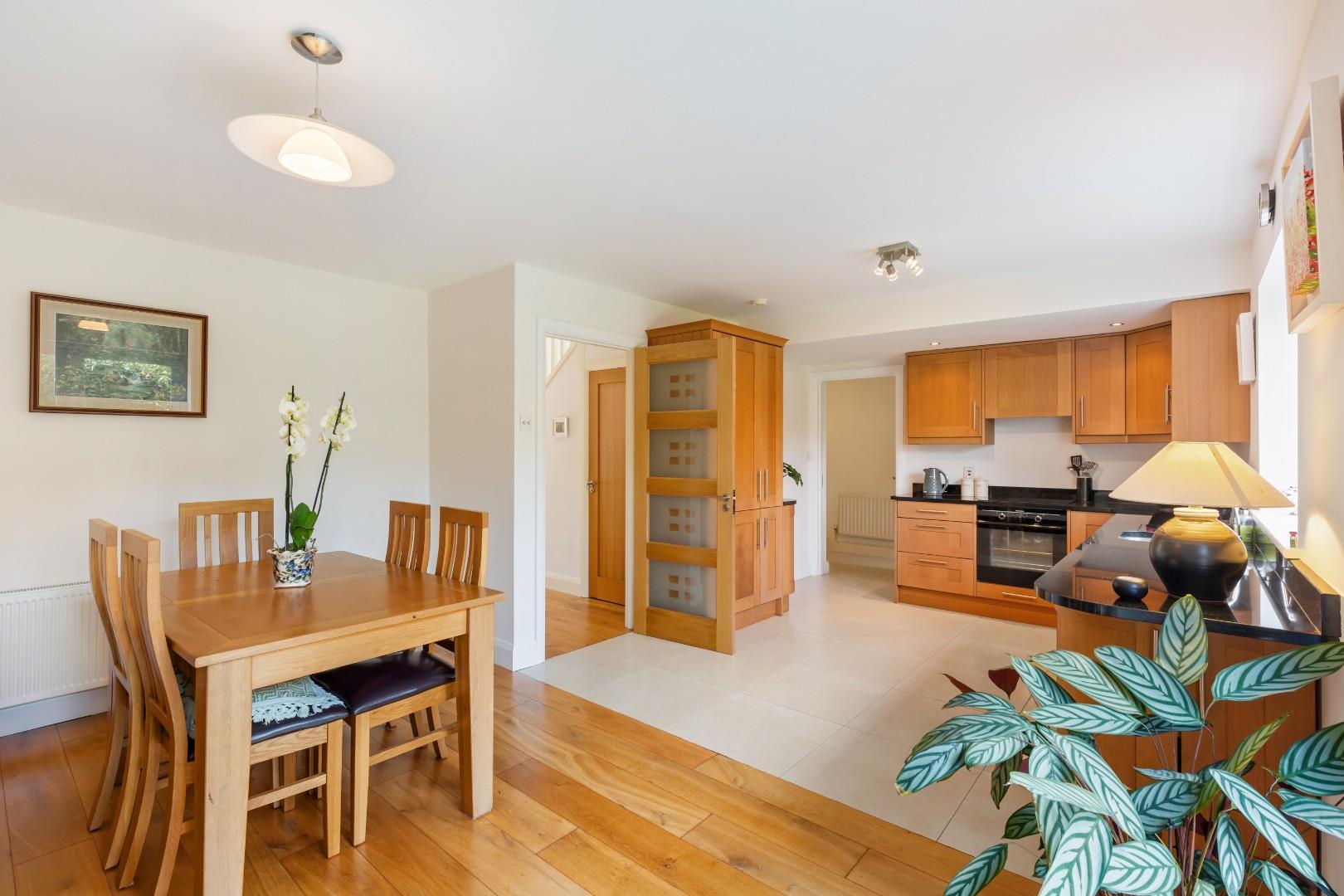 Large L - shaped open plan room with patio doors opening to the delightful rear garden. The kitchen area has a tiled floor and is fitted with quality solid oak wall and floor cupboards with black granite work-tops. Integrated appliances include an oven with electric hob, fridge/ freezer and dishwasher. There is also a clever pull- out pantry unit, recessed ceiling lighting and filter drinking water tap. The focal point of the dining room is a cast iron solid fuel stove which brings additional warmth during the winter months.