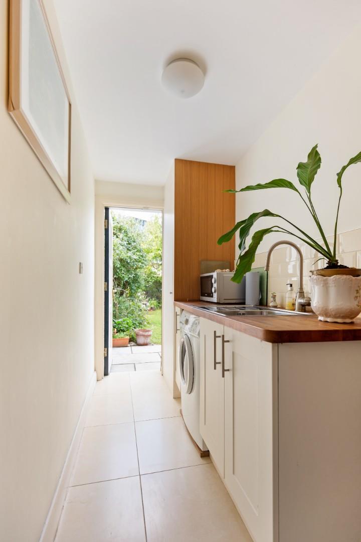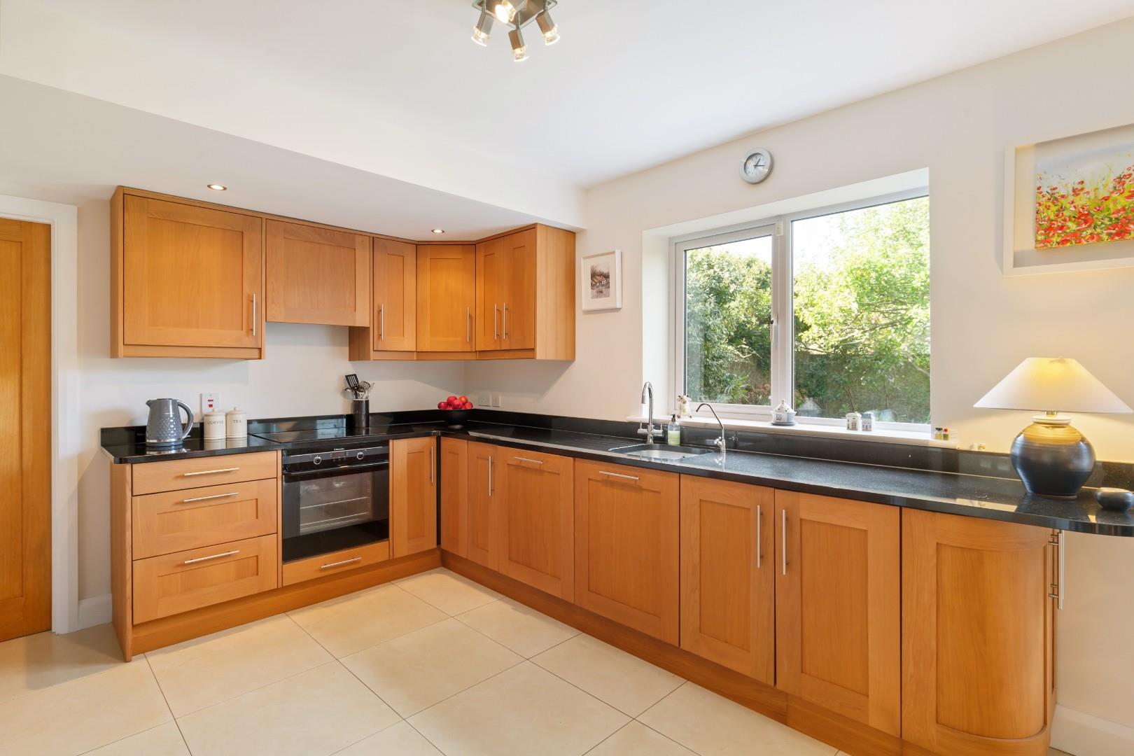 With excellent built in storage, additional sink and plumbing for a washing machine. Hot press cupboard. Tiled floor and access to both the rear garden and through to the garage.