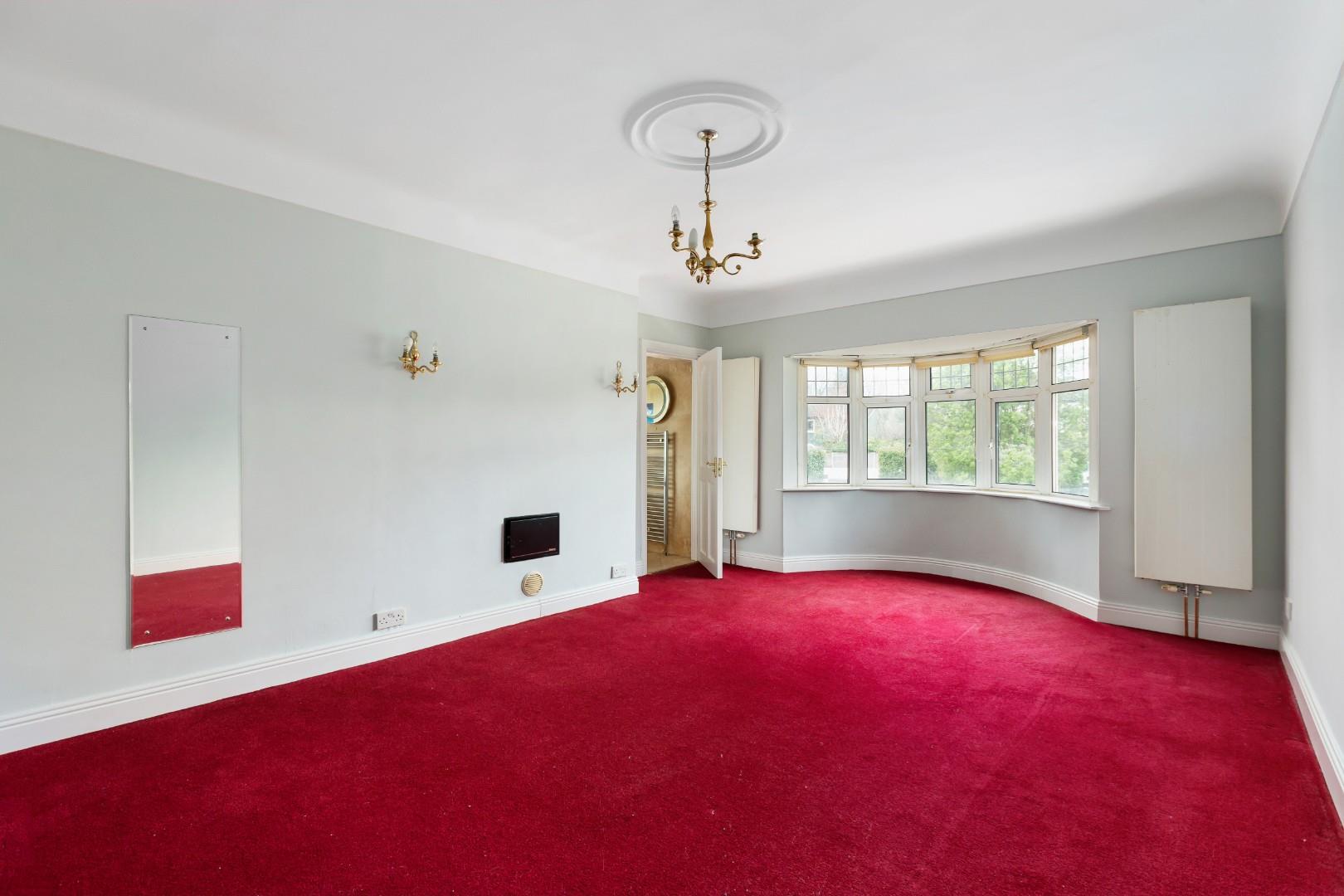 Large master bedroom with a bow window.