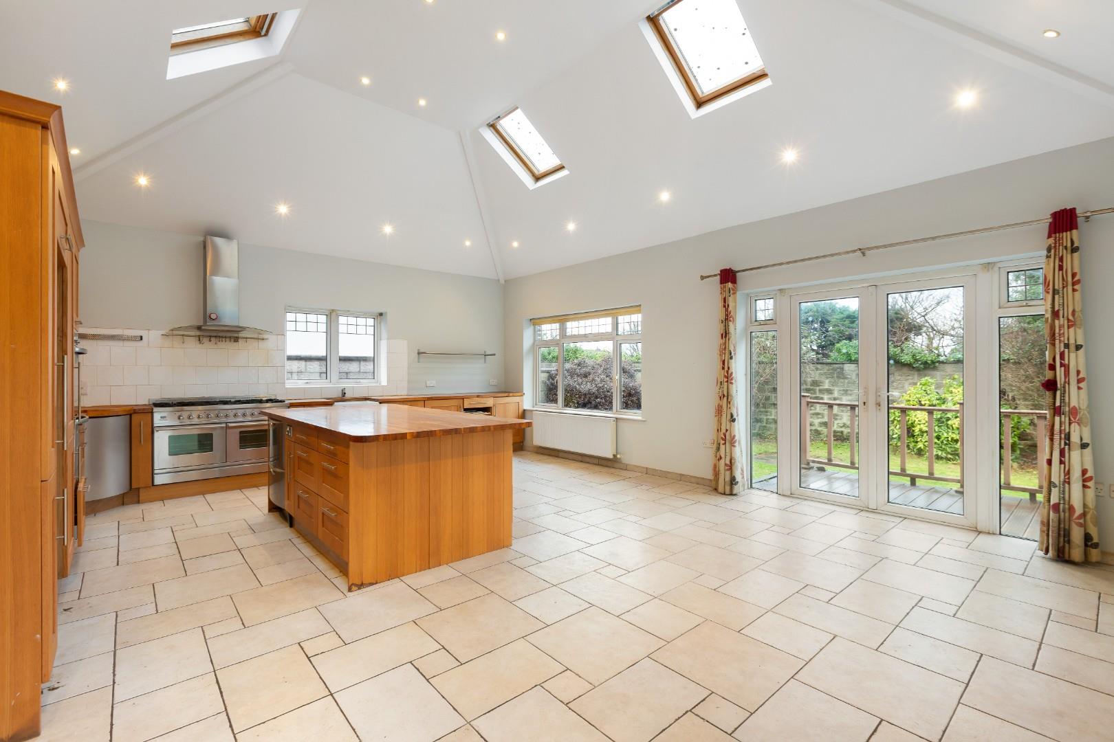 Large light filled extension with multiple ceiling skylights and two sets of patio doors to the rear garden. Fitted with an extensive range of shaker style wall and floor cupboards with a large centre kitchen island and ceramic Belfast sink. Appliances include a large double stove with gas hob, eyeline oven, fridge freezer and dishwasher. Tiled floor.