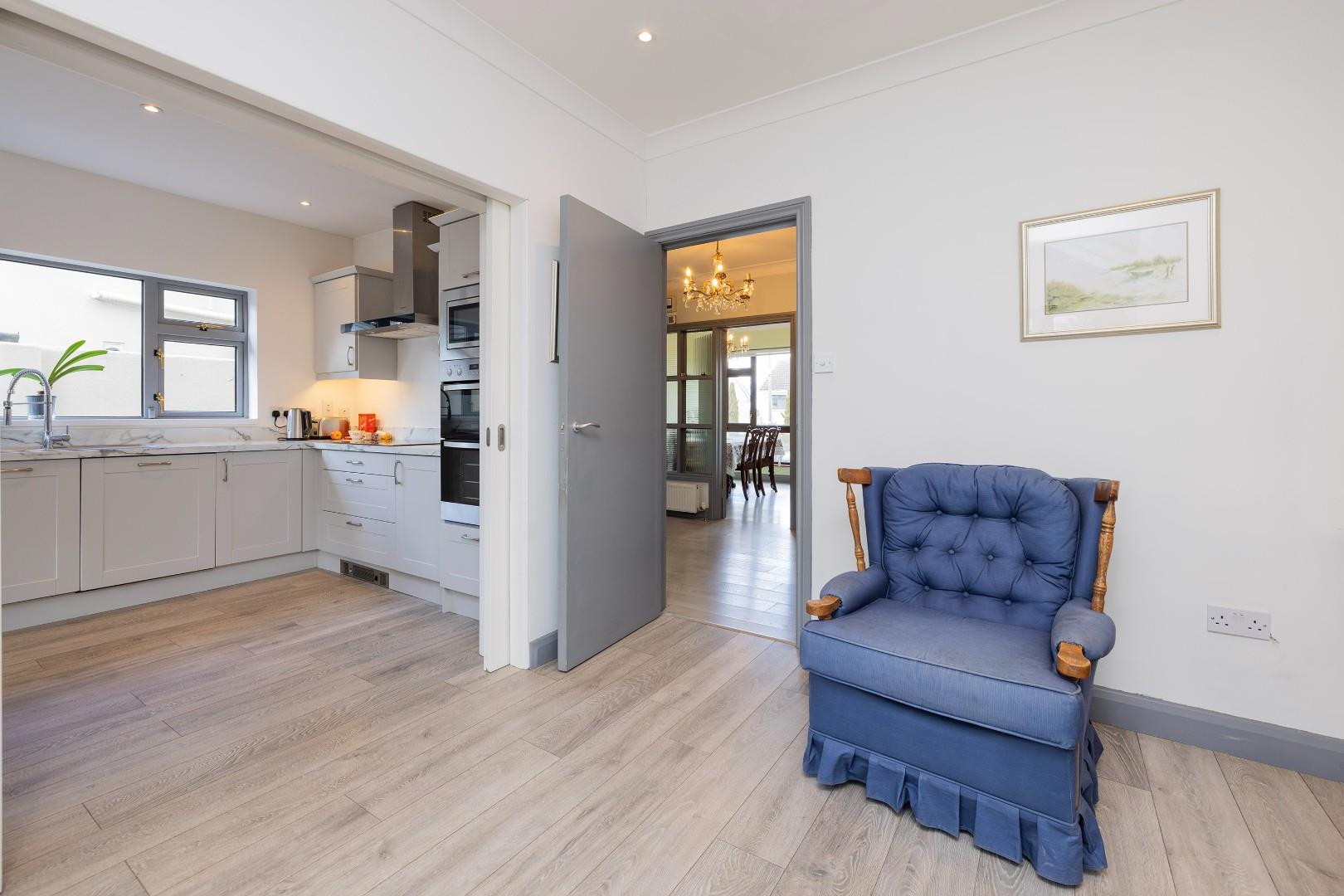 A cosy snug, with coved ceiling, recessed downlighters, laminate flooring, with a solid fuel stove with timber mantel providing a focus for this comfortable space, open to the family area and pocket doors to the
