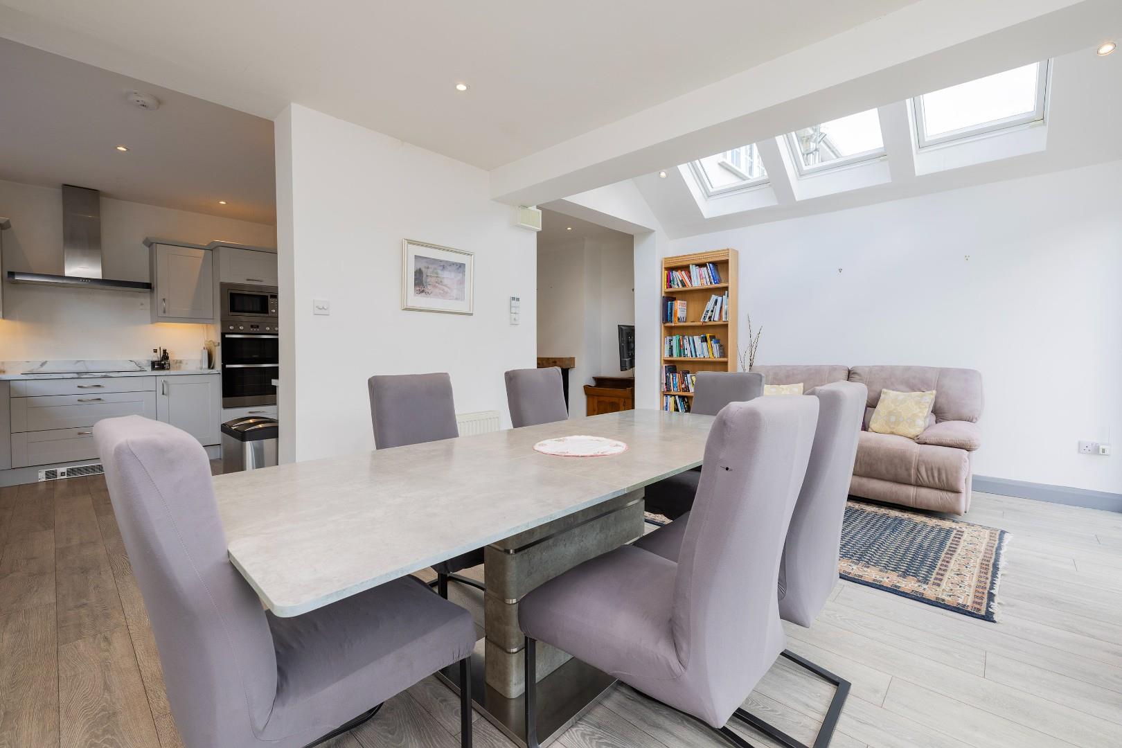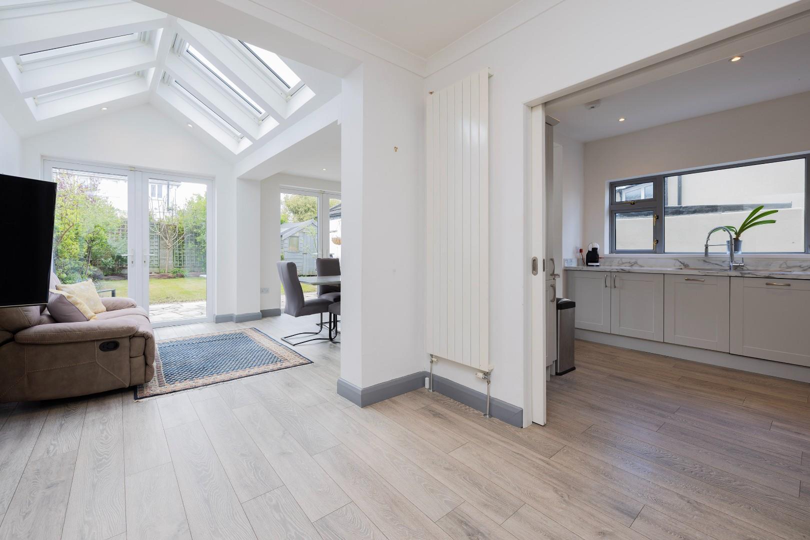 Extended area -bright and airy with partial pitched roof with six roof lights, recessed down lighters, laminate flooring - the perfect space for entertaining, with twin French doors leading to the wonderfully sunny patio and garden. Access to