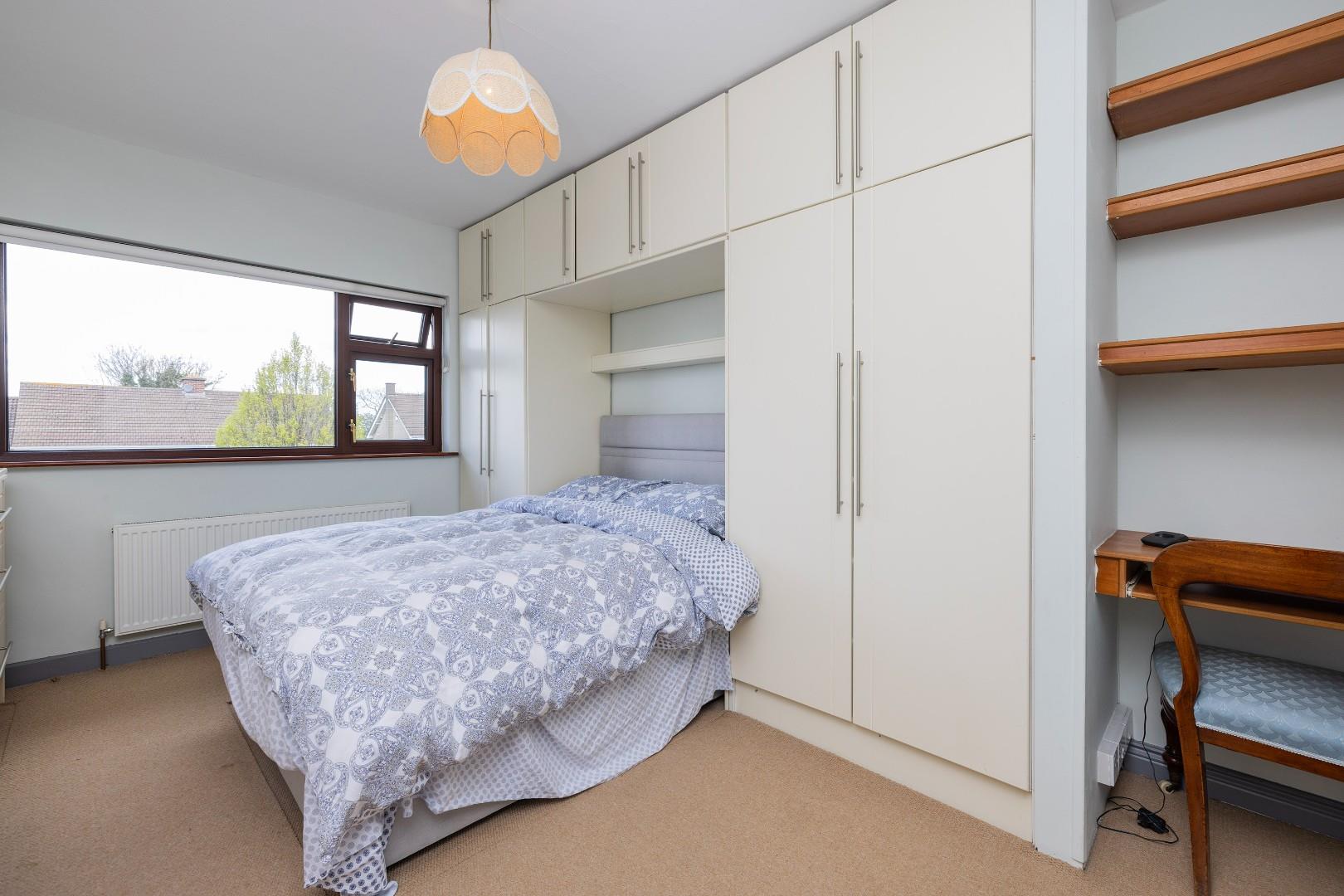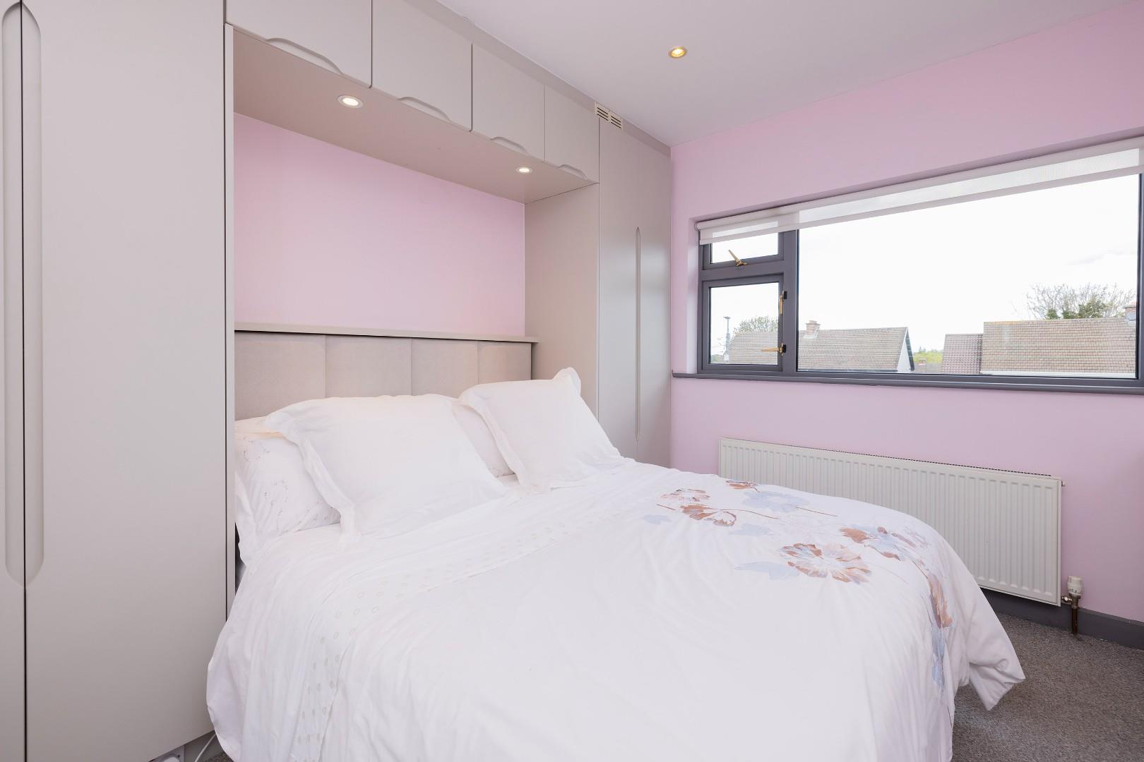 Principal bedroom overlooking the front garden with built-in wardrobes and bespoke low level built-in drawers and storage units.