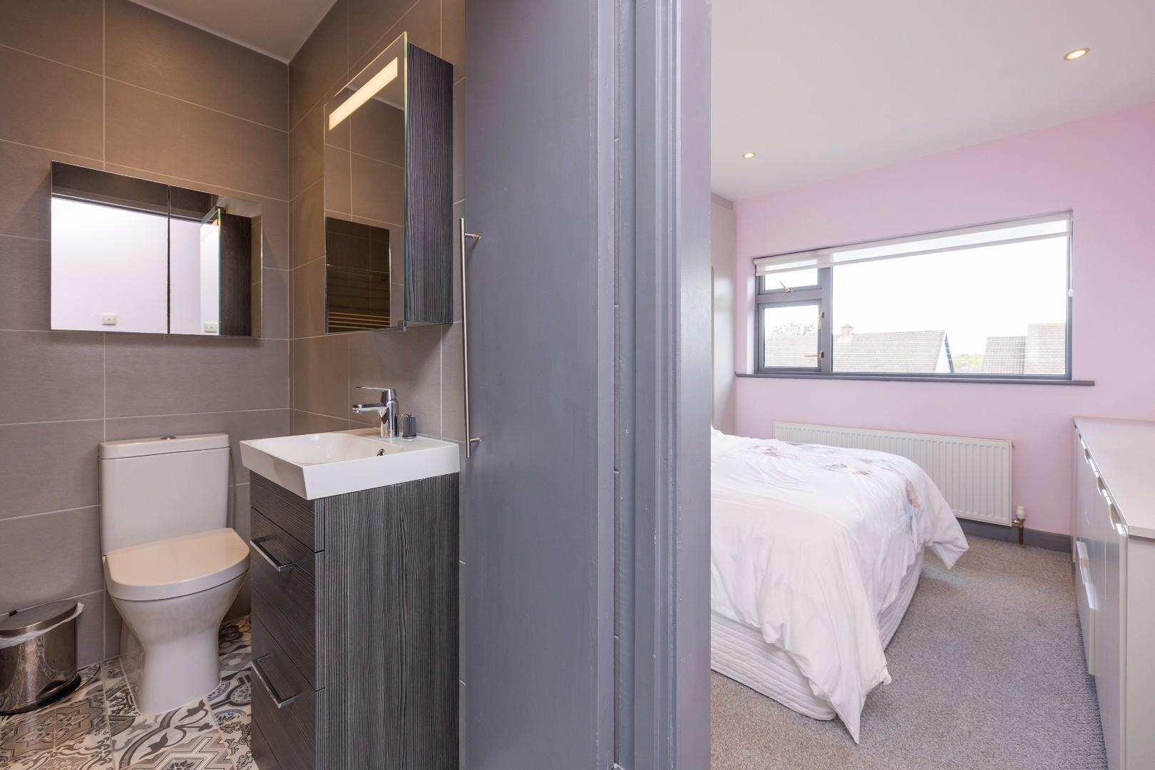 Well-appointed contemporary with similar finish to ensuite with floor and wall tiling, shower cubicle with curved screen and electric shower unit, concealed cistern W.C., vanity W.H.B., and towel radiator.