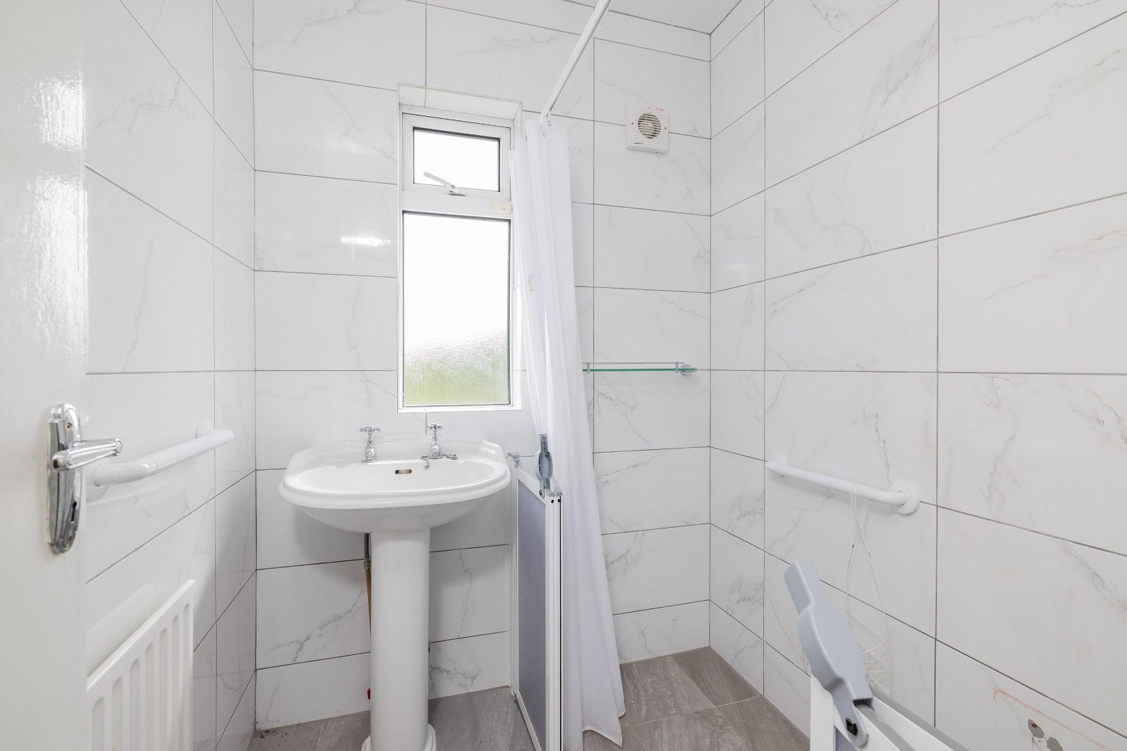 Stylish modern shower room, fully tiled “wet room” style with walk in shower complete with electric shower unit and pedestal mounted w.h.b.