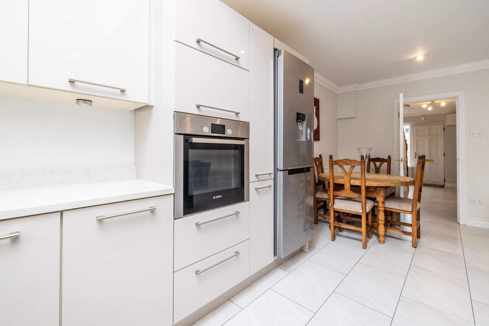 Perfect for modern day living with tiled flooring carried through from the hall. Extending the width of the house with coved ceiling, recessed downlighters and a sliding patio door to garden from the family area. There is plenty of room to dine and entertain with a stunning modern u-shaped kitchen with overhead roof light with an array of high gloss floor and wall mounted unit incorporating a built -in oven, ceramic hob with overhead extractor unit, an integrated dishwasher and washing machine, space for fridge/freezer and a built-in wine cooler. There are attractive travertine style worktops with upstands and countertop lighting.