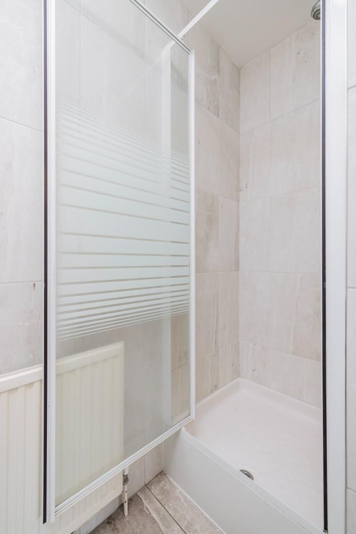 Fully tiled with shower cubicle complete with thermostatic shower valve and screen, w.h.b. and w.c.