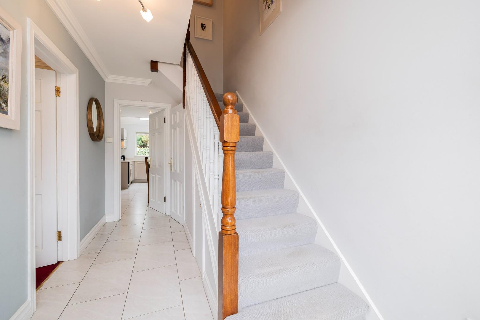 Covered open porch with attractive stained glass side window with panelled door leading to the welcoming hall, with coved ceiling and contemporary matt finished floor tiling with access to understairs storage and