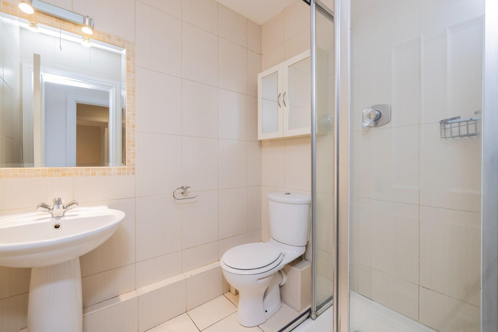 Fully tiled with walk in shower cubicle, pedestal w.h.b. with overhead mirror with vanity light, w.c., and bathroom cabinet.
