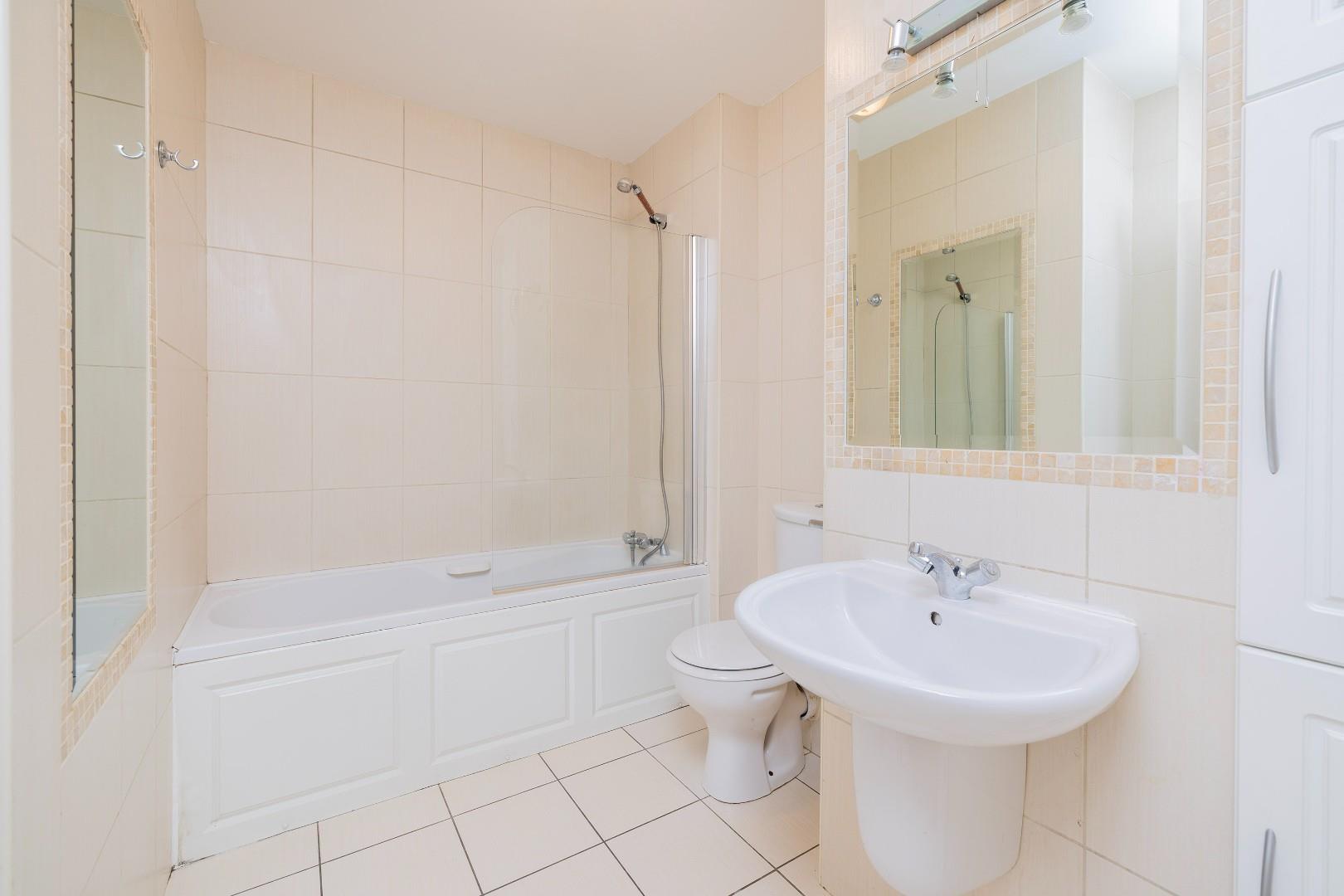 A good-sized bathroom, fully tiled with bath, complete with flexible shower head and screen, w.c., w.h.b. with overhead mirror and vanity light, built-in storage press, and full height wall mirror.