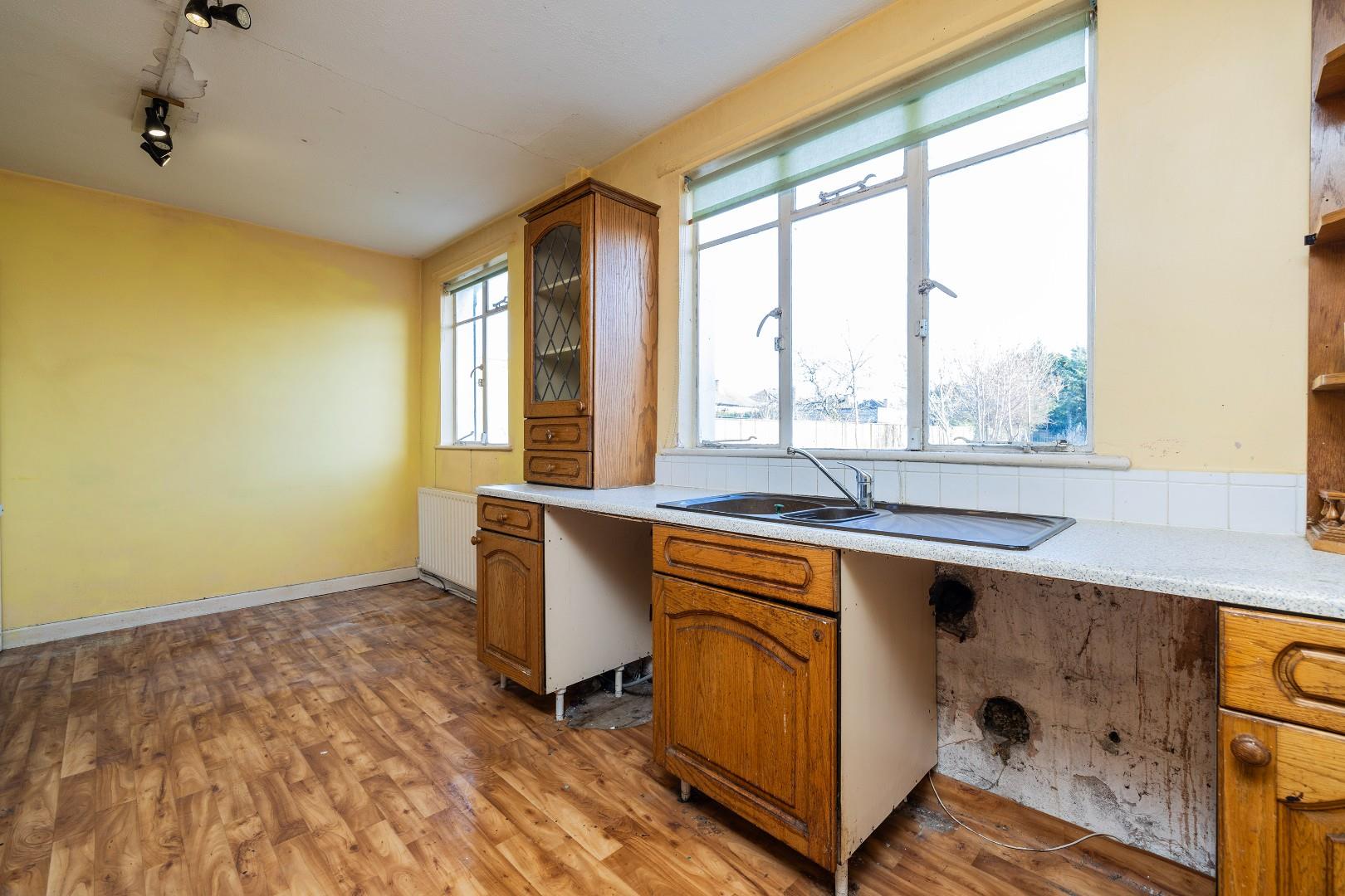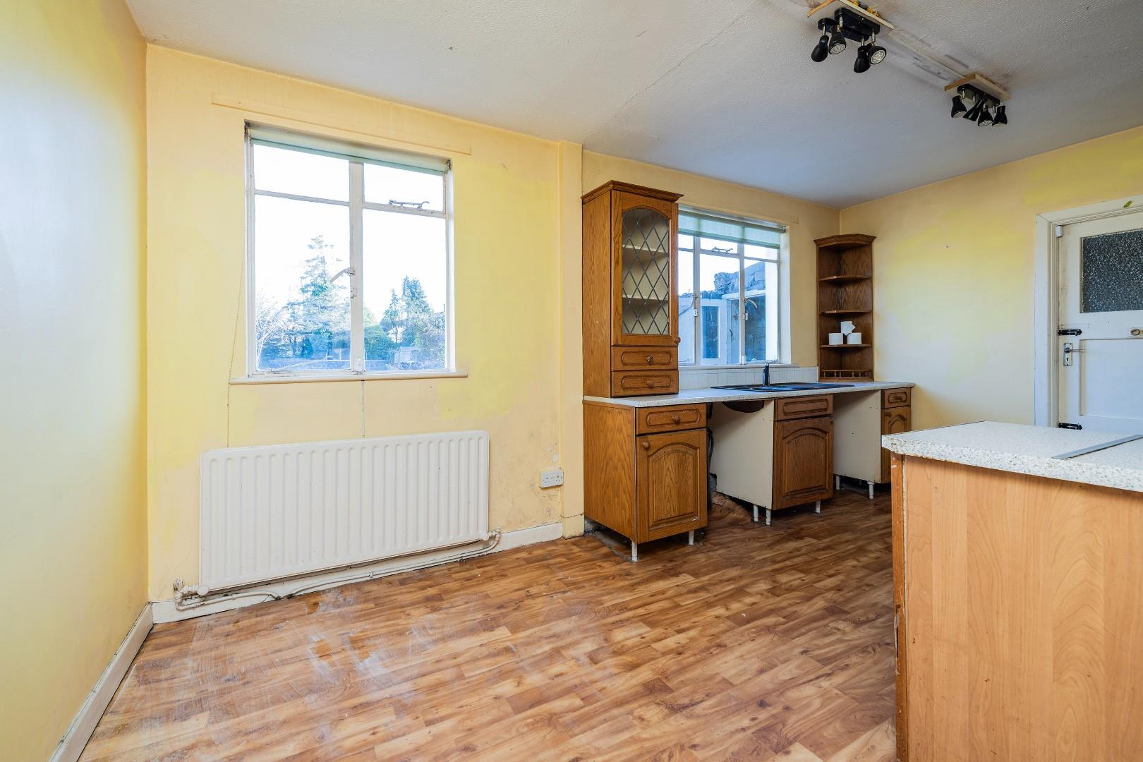 With two windows overlooking the rear garden, with ample room to dine, with floor and wall mounted units incorporating a hob and oven. Access to garden via covered side passageway.