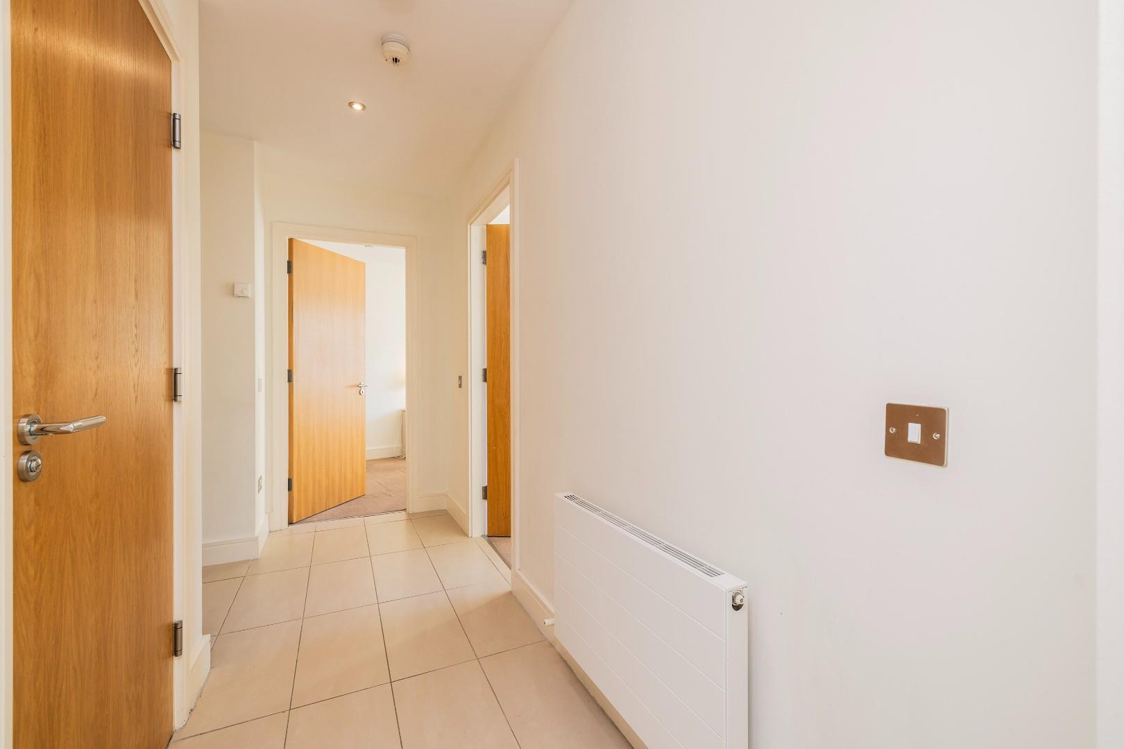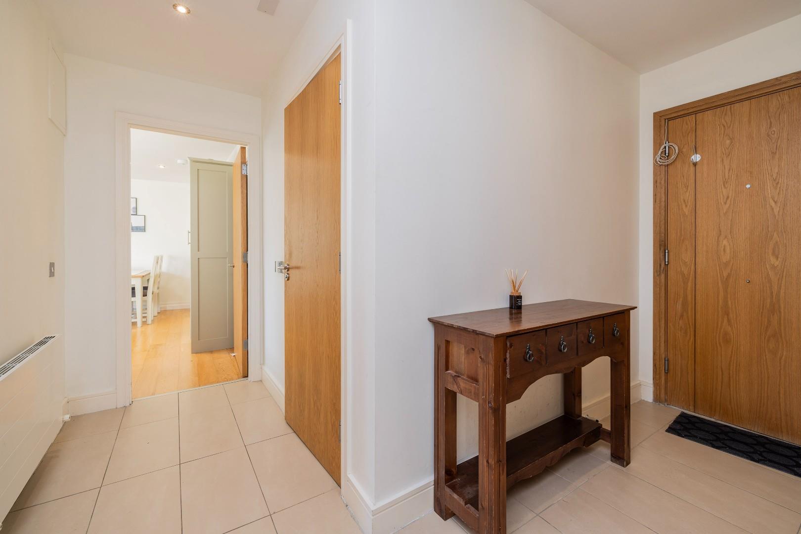 Well-proportioned hall with ceramic tiled flooring, recessed lighting and a storage closet.