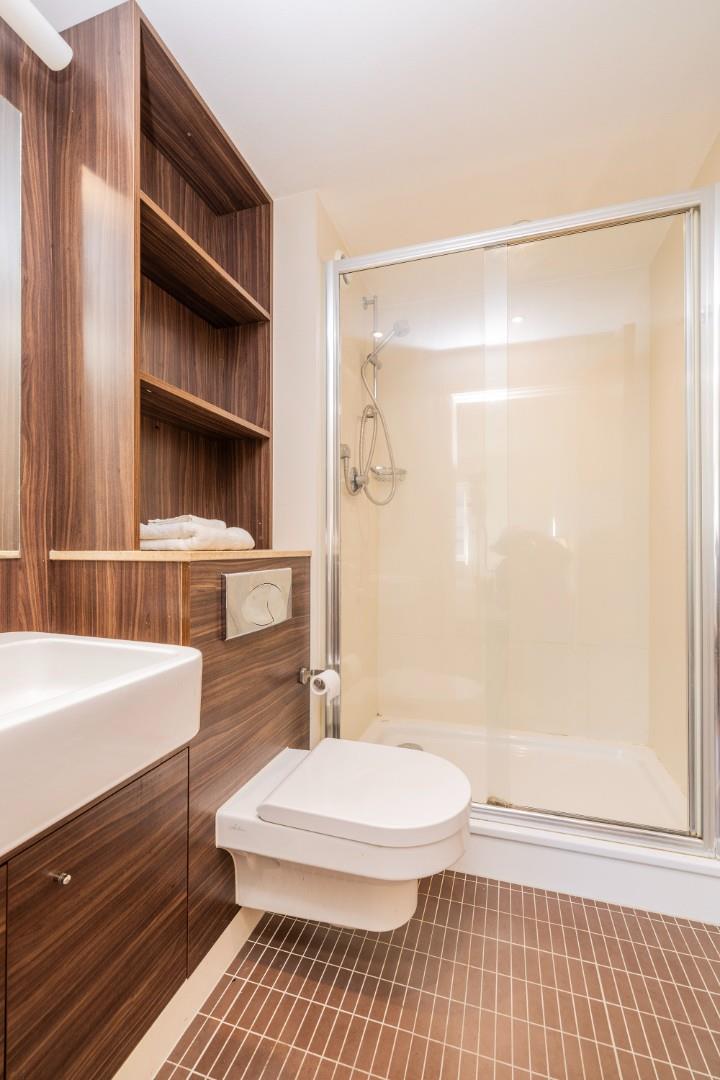 Modern, stylish, partially tiled bathroom, with recessed downlighters and suite comprising of a w.c., a bath with handheld flexible shower head, wall mounted w.h.b. with walnut vanity shelves and granite counter tops
