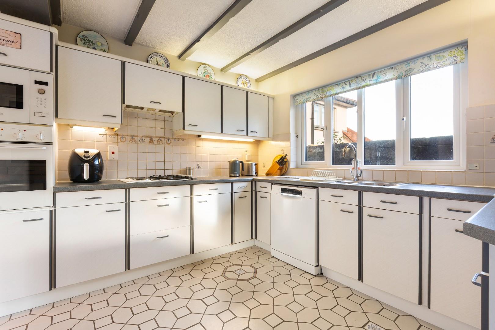 The kitchen is fitted with generous wall and floor cupboards with a breakfast counter. Appliances include a double oven, dual electric and gas hob, dishwasher and fridge freezer. Tiled floor and ceiling spotlights.