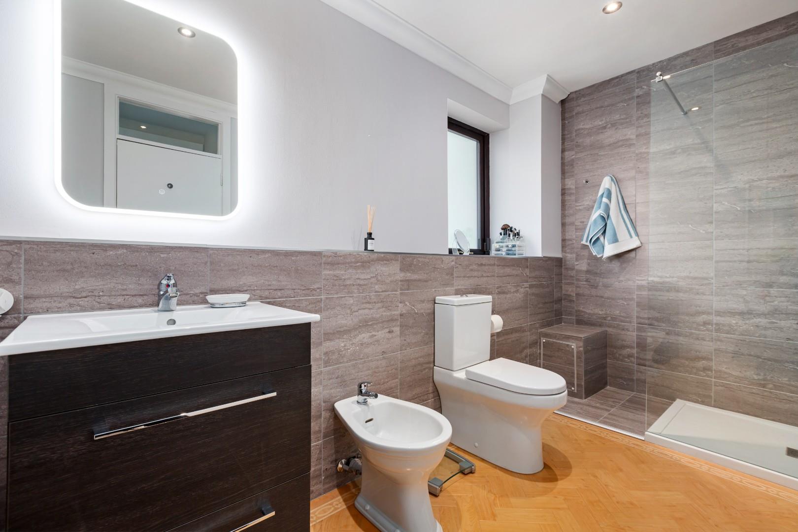 Larger than average bathroom which has been upgraded to include a wash hand basin pedestal, W.C., bidet and double shower cubicle with glass screen and chrome shower fittings. Heated towel rail. Charcoal grey tiled walls and wood effect herringbone tiled flooring. Recessed ceiling spotlights.