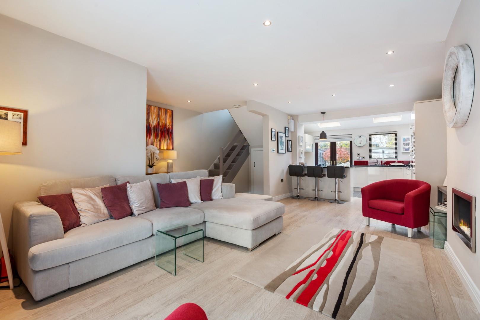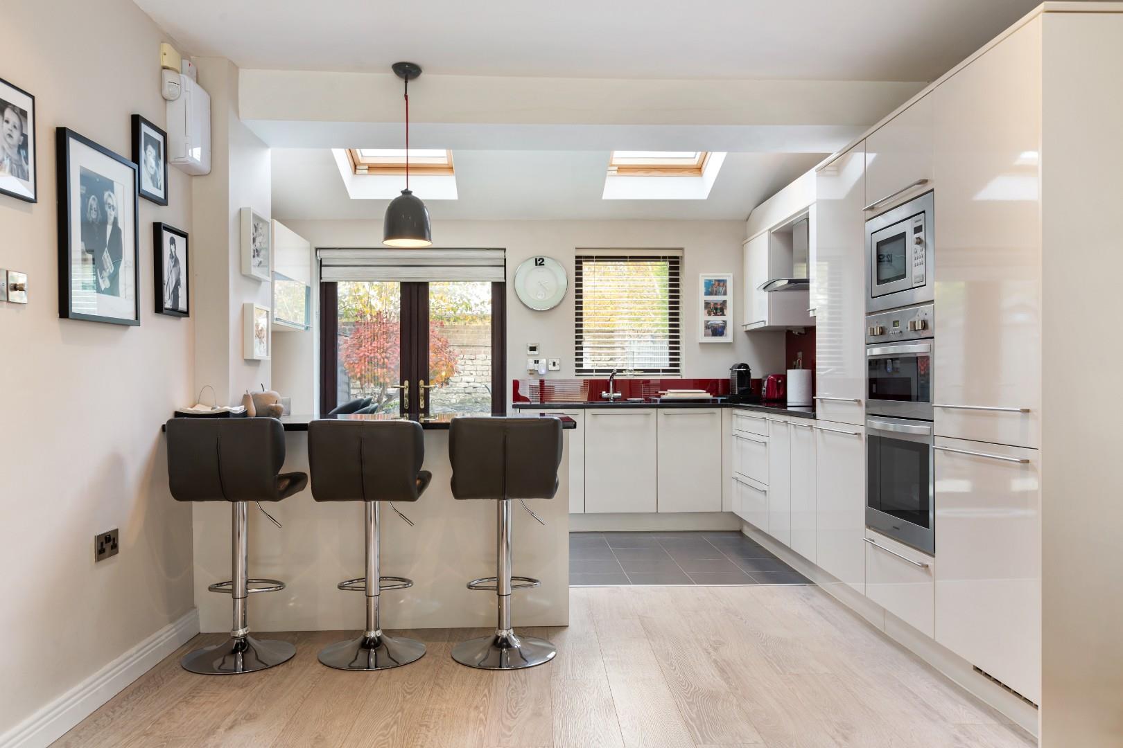 The focal point of this well proportioned reception room is a raised gas fire inset, providing additional warmth to this cosy home over the winter months. Sliding patio doors open to the front garden and a convenient storage cupboard is located under the stairs. Wide plank wooden flooring and recessed ceiling spotlights. A breakfast bar separates the living area from the kitchen.