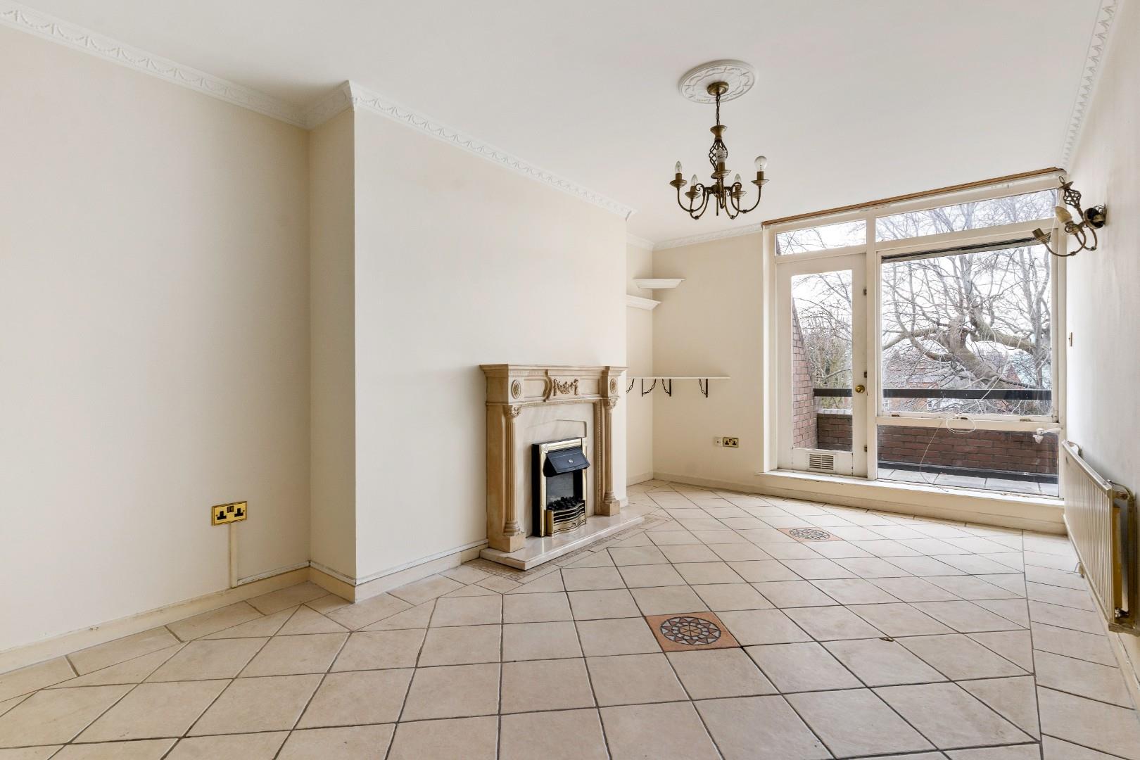 Bright light-filled room with access to the balcony. Tiled floor. Fireplace with electric fire inset.